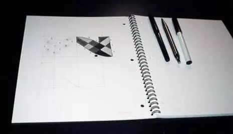 经过一番草图的设计后,我决定了完全对称的概念来设计外形,"W"和"M"的外形正好呈为镜射,因此,我的设计重点转移到有格线的簿子上。